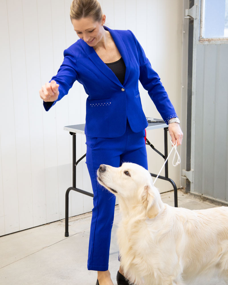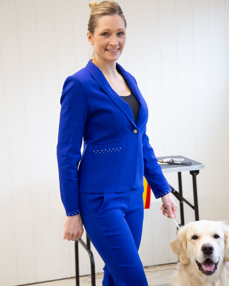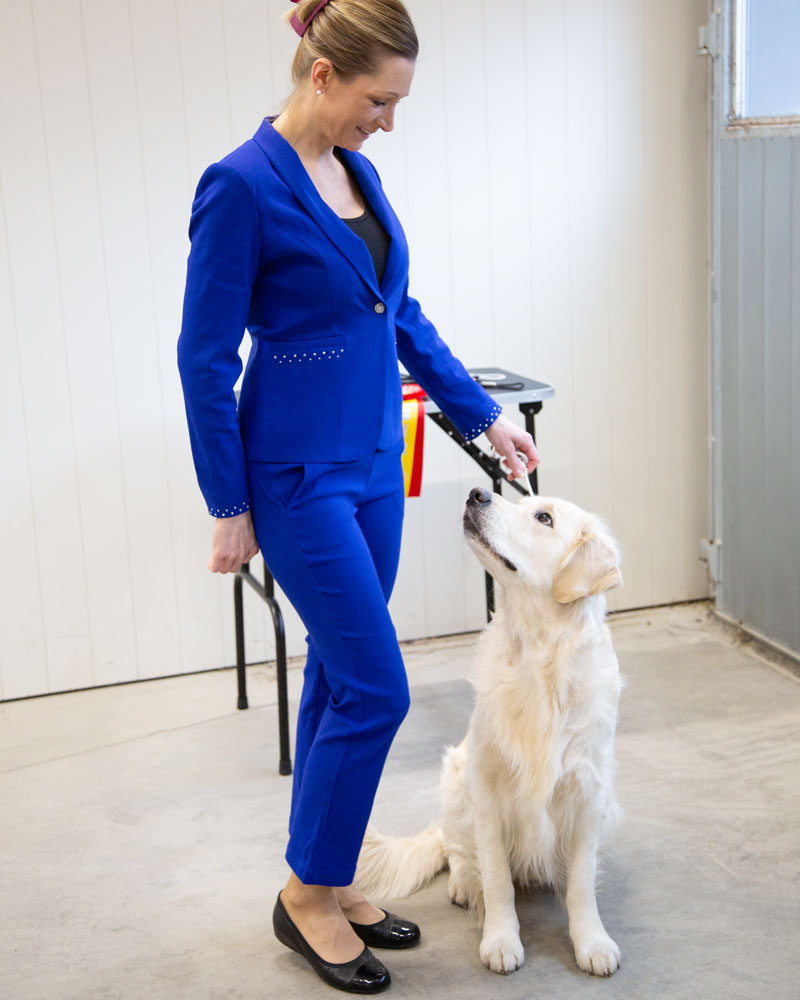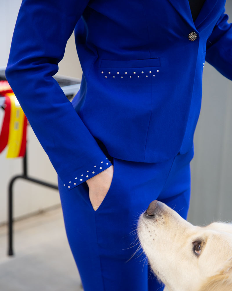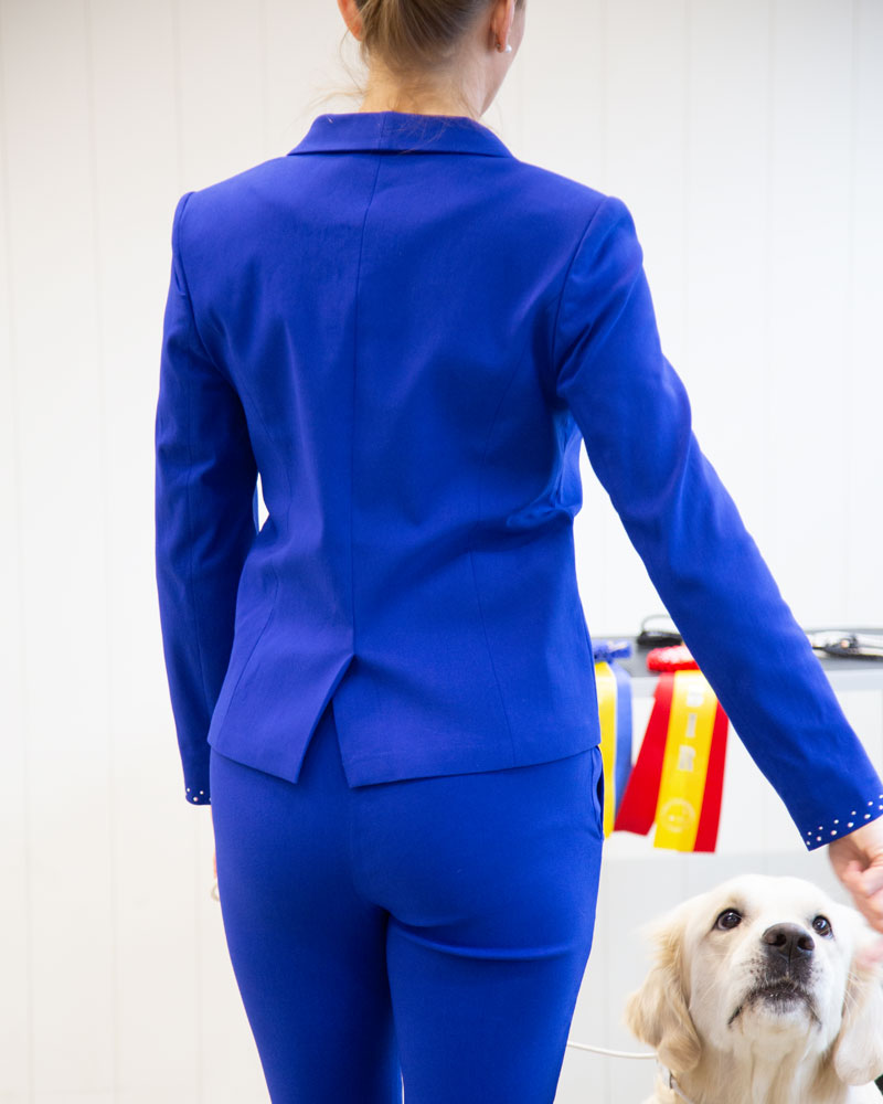 Tenue de handler élégante avec pantalon longueur cheville et blazer classique assorti. Le pantalon et le blazer disposent chacun de deux poches doublées d’un matériau imperméable pour les friandises pour chien.