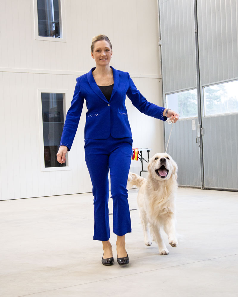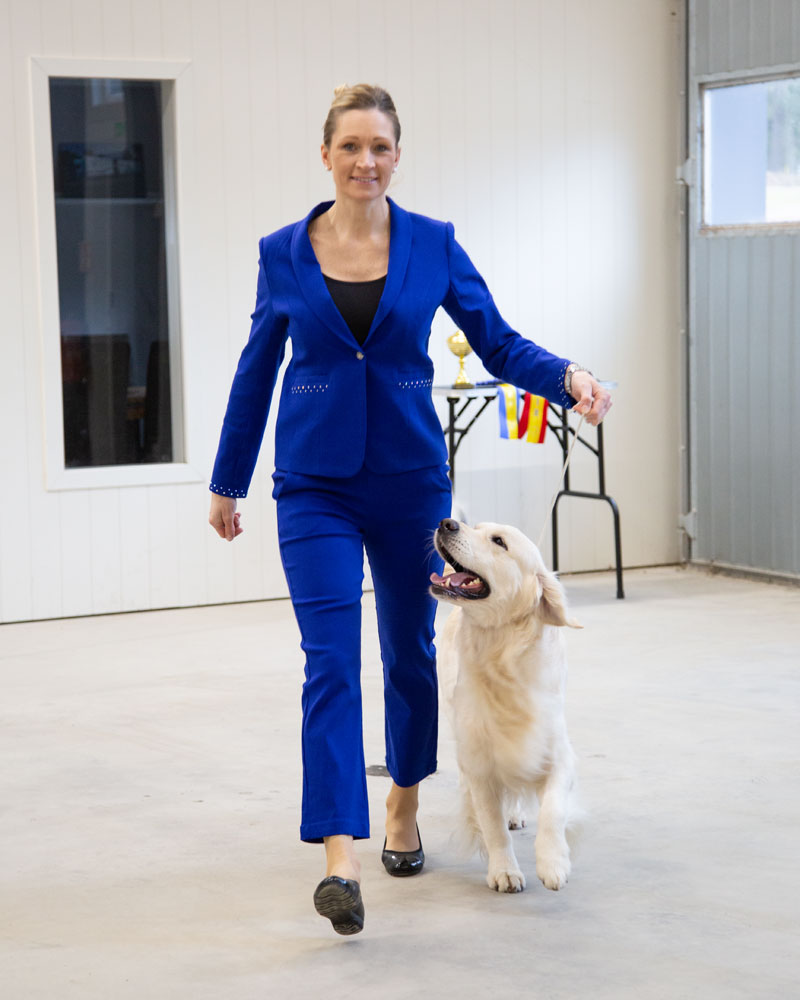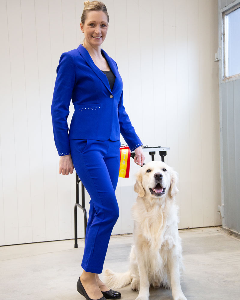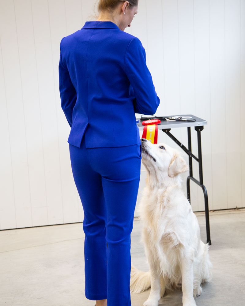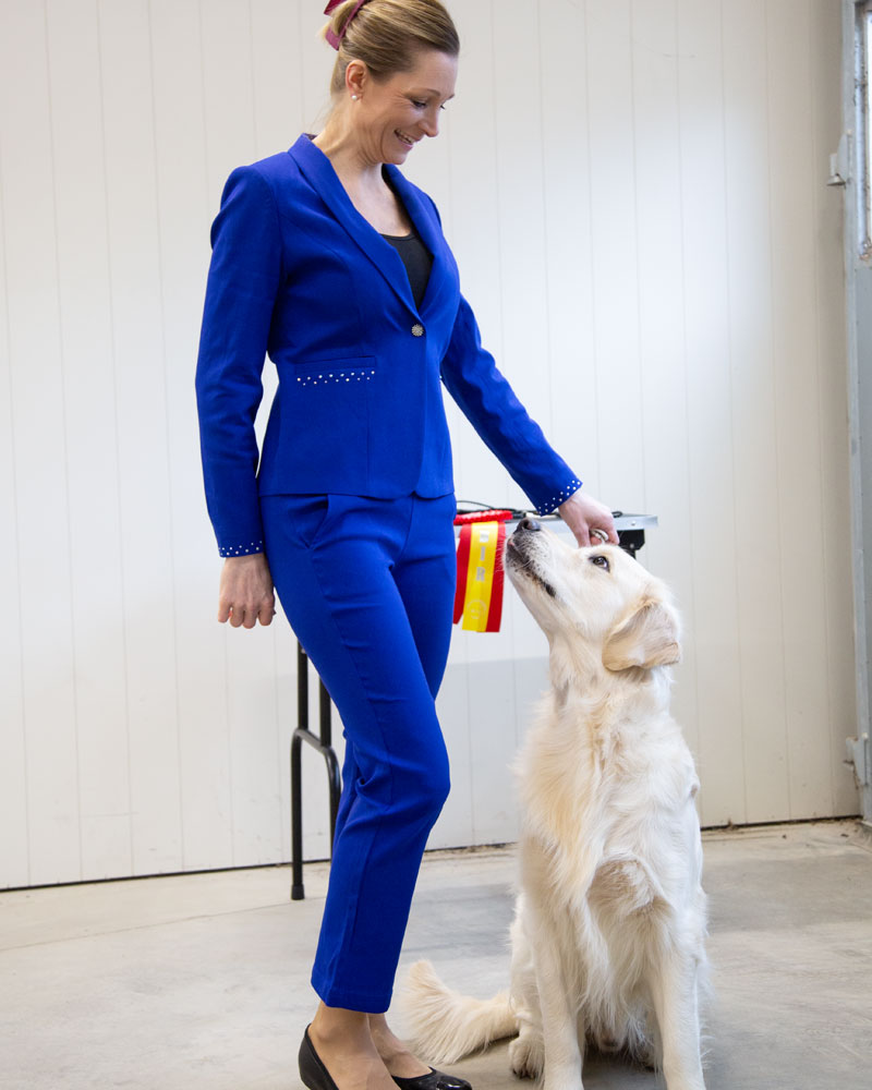 Tenue de handler élégante avec pantalon longueur cheville et blazer classique assorti. Le pantalon et le blazer disposent chacun de deux poches doublées d’un matériau imperméable pour les friandises pour chien.