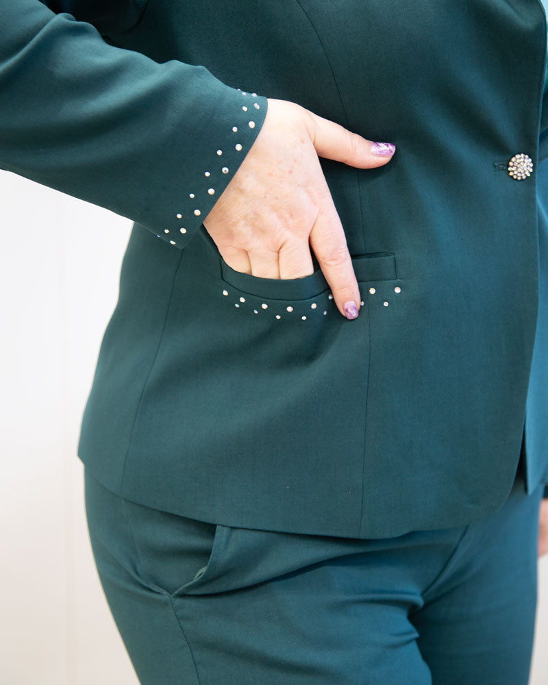 De petites pierres scintillantes décorent les poches et les poignets du blazer.