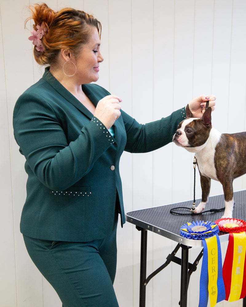 Tenue de handler élégante avec pantalon longueur cheville et blazer classique assorti. Le pantalon et le blazer disposent chacun de deux poches doublées d’un matériau imperméable pour les friandises pour chien.